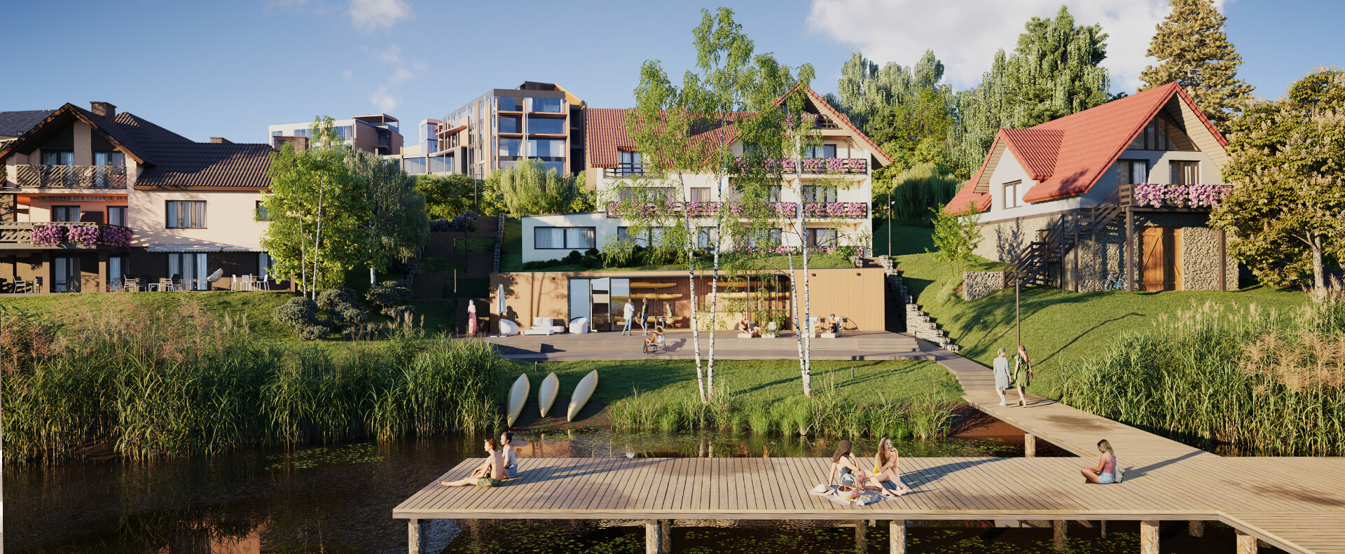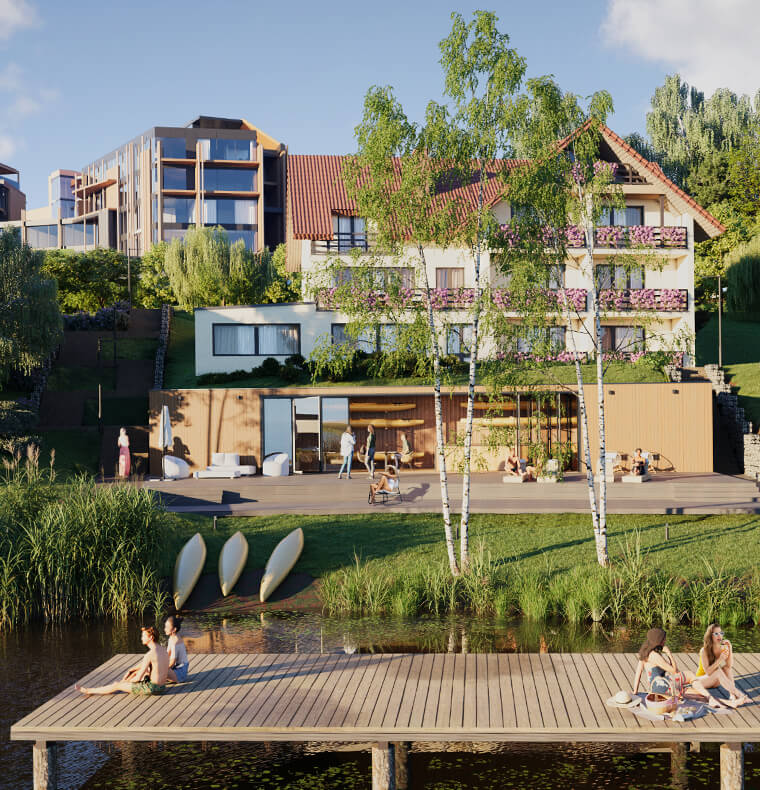 Wspaniała lokalizacja to jeden z najważniejszych atutów Pratum. Wykorzystaliśmy położenie nad jeziorem, dając mieszkańcom dostęp do pomostu. Wiemy, że nie zawsze są możliwości na relaks w otoczeniu natury, więc wszystkie udogodnienia przygotowaliśmy na terenie kompleksu Pratum.